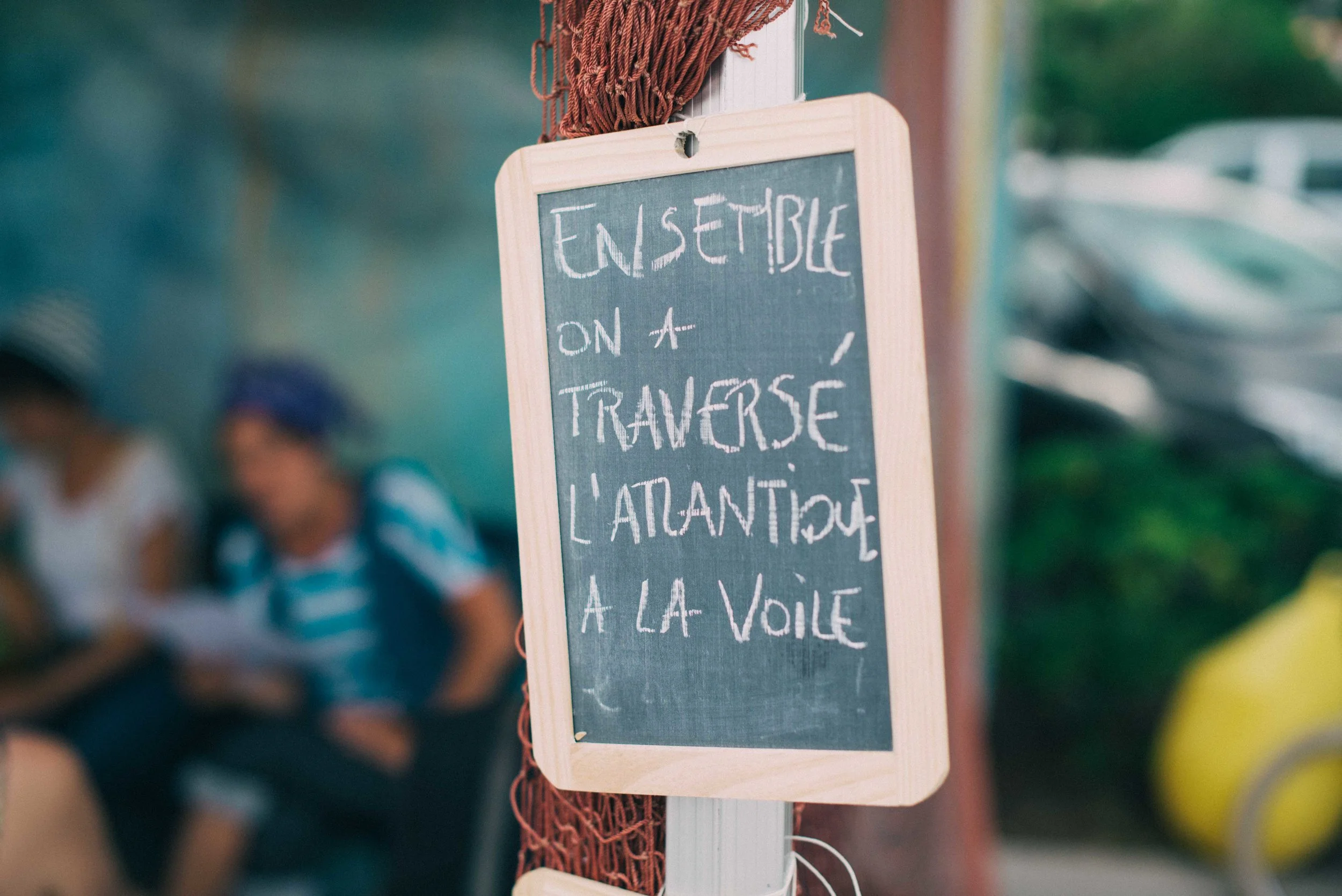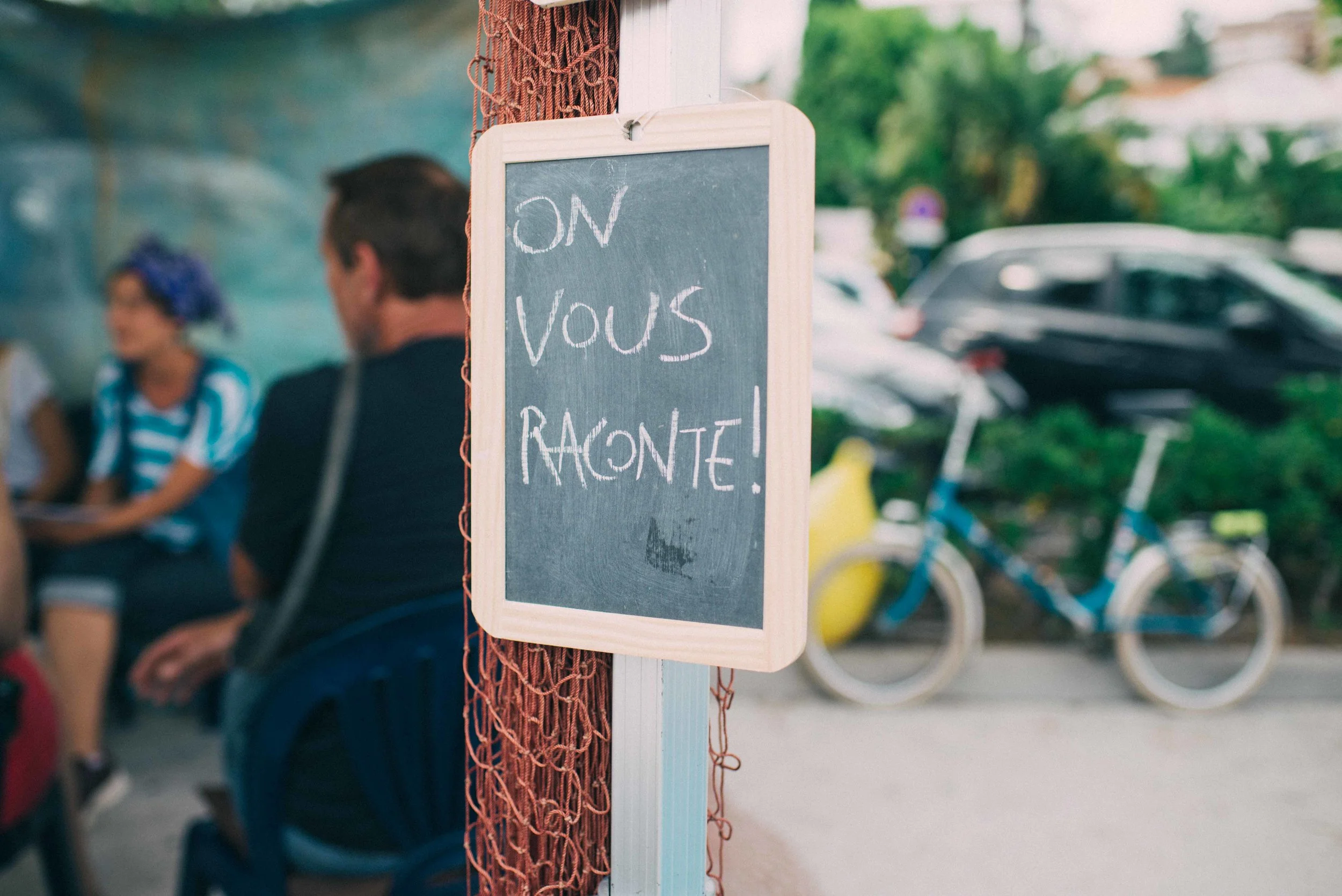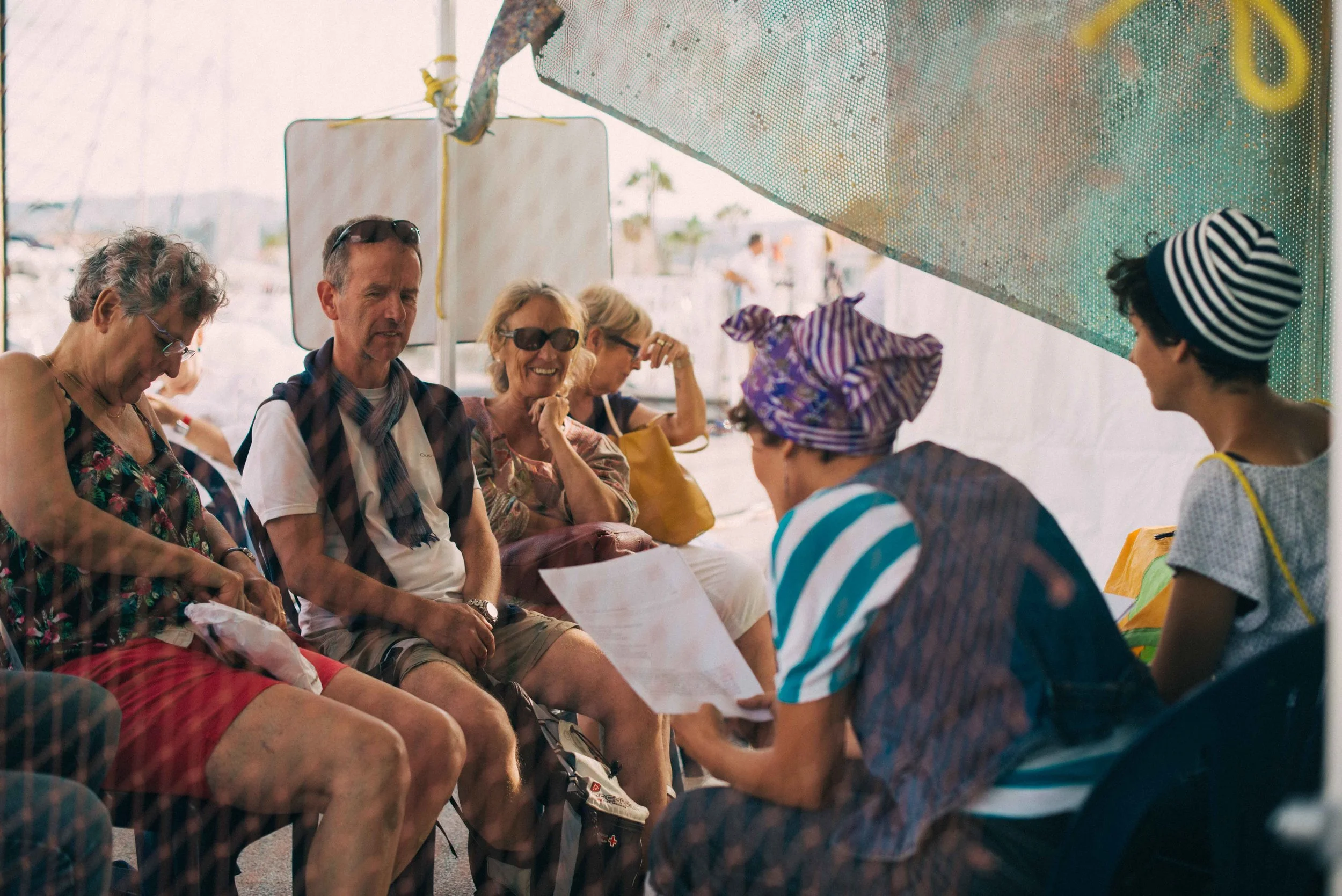 17h59. Un homme s'arrête. « Oh ! j'adore les aventures ! » Et de un. Le mouvement appelle le mouvement. Une femme passe, accroche du regard notre décor, chope au vol le mot « Transatlantique », et vient s'asseoir. Un autre s'approche : « moi aussi j'ai fait la Transatlantique, et dans les deux sens ! ». Il prend place... Voilà, nous avons un public sous notre petite tente.